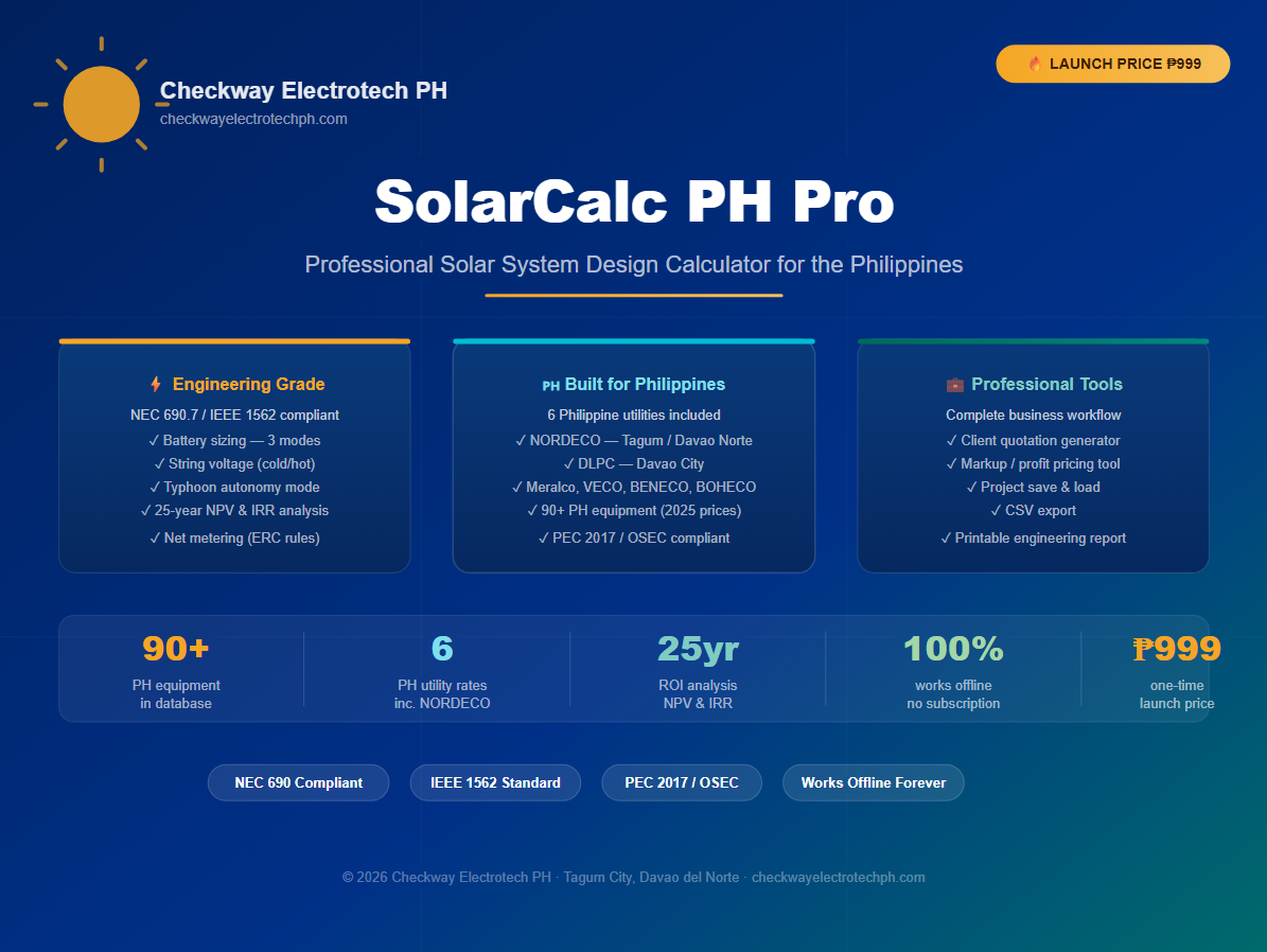 SolarCalc PH Pro is a complete solar system design and financial calculator built exclusively for the Philippine market. Unlike generic online tools that only accept your monthly bill and give you a rough panel count, SolarCalc PH Pro performs full engineering-grade calculations following NEC Article 690, IEEE 1562, and PEC 2017 — the same standards required by MERALCO, NORDECO, DLPC, and other Philippine distribution utilities for net metering applications.